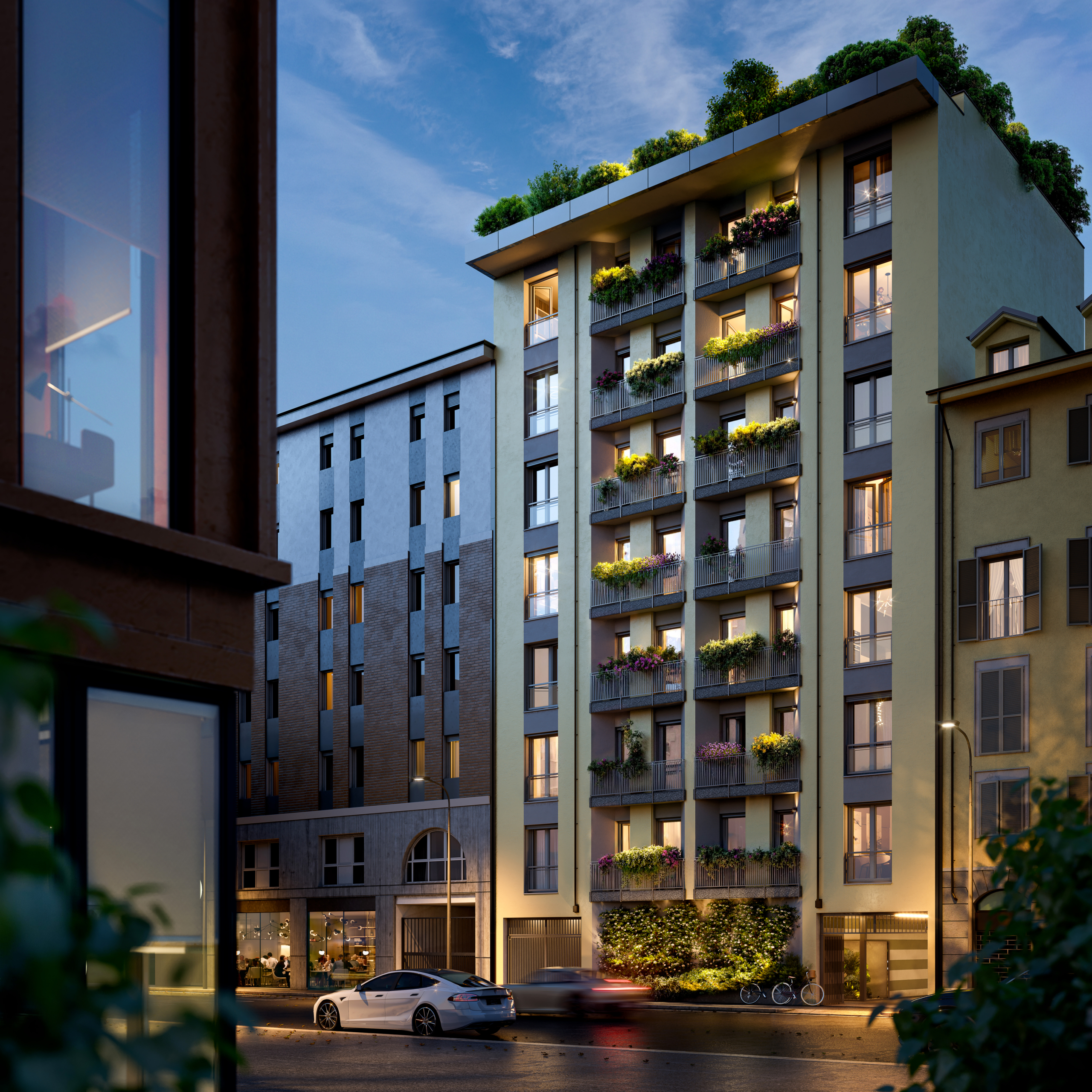 L’edificio, in classe A, si presenterà con la facciata e gli spazi comuni rinnovati e valorizzati da materiali e finiture di pregio, per offrire un’esperienza abitativa elegante e completa.